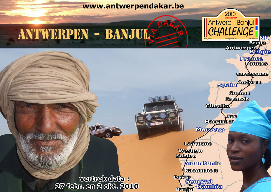 "Koop/regel een auto of motor en ga de uitdaging aan om dwars door de Sahara via Dakar naar Gambia te rijden. Na een spectaculaire reis van bijna 7000 km en een geweldige ervaring rijker, schenk je de auto in Gambia aan het project van jouw keuze. Spreekt dat je aan? "